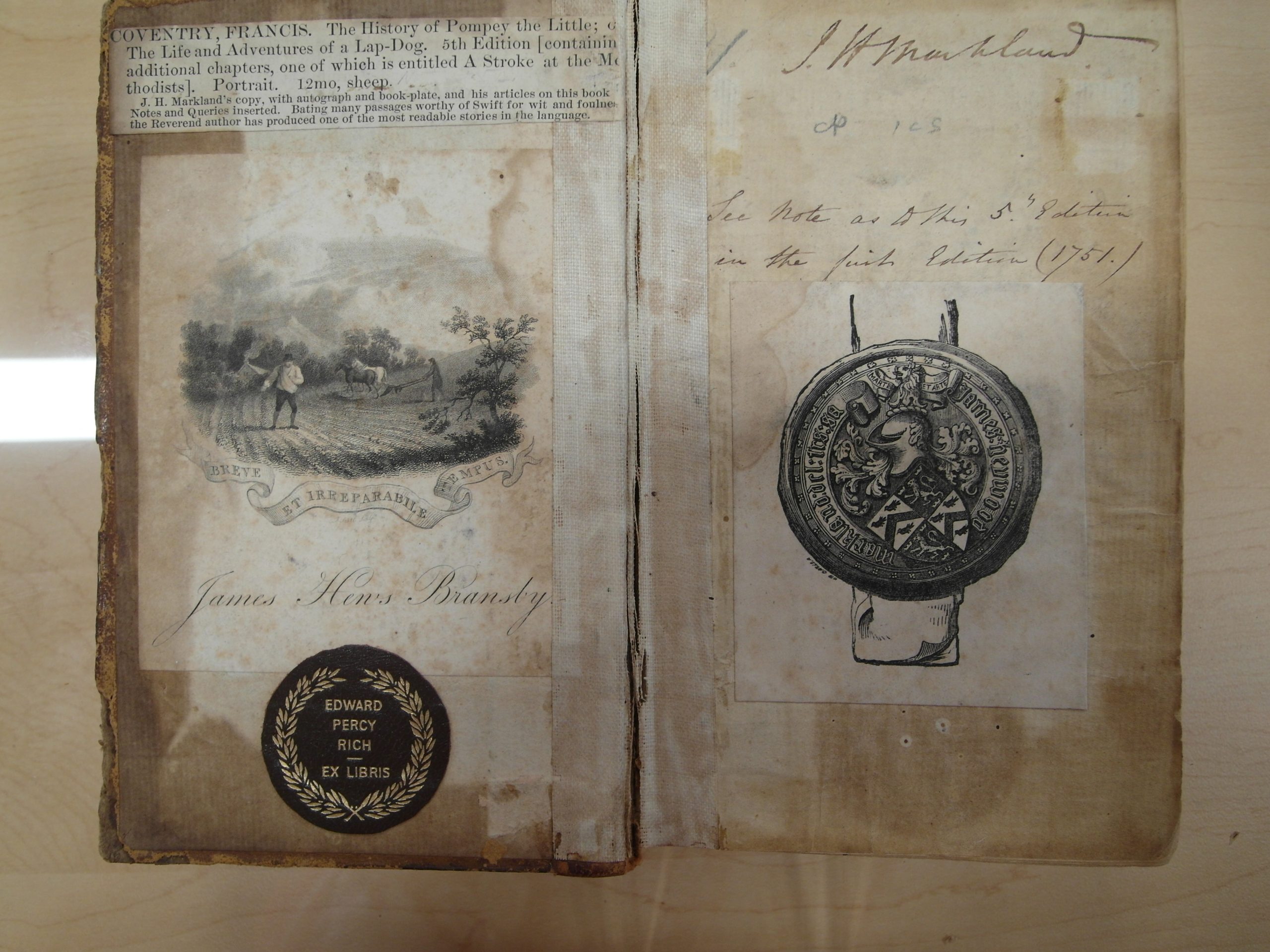 This fifth edition of The History of Pompey the Little by Francis Coventry seems to have belonged to three different people over time: “James Heywood Markland”/”J.H. Markland,” “James Bransky,” and “Edward Percy Rich.”