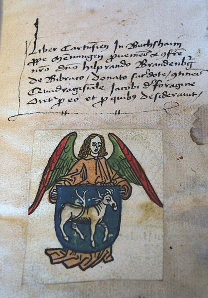 Printed on wood block and then colored by hand, it originates from Brother Hildebrand (Hilpbrand) Brandenburg of Biberach, Germany. Today, it is also revered as one of the oldest examples of a bookplate.