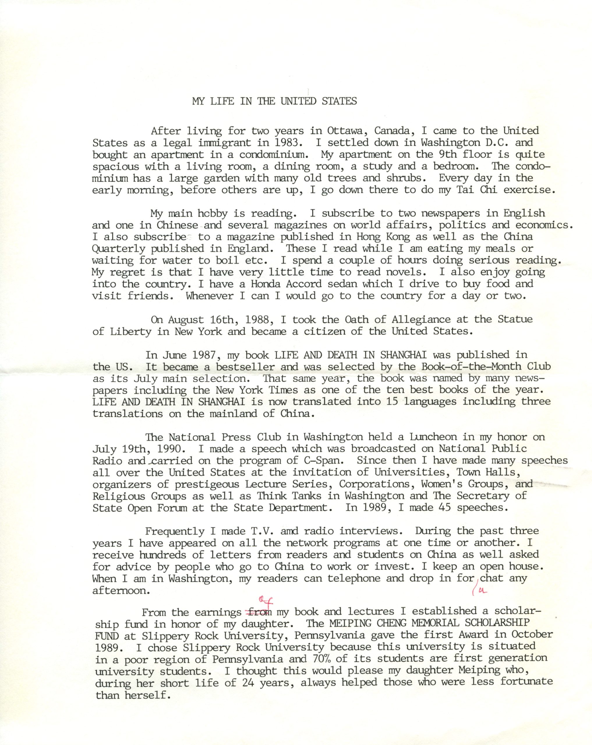 The Chinese Communist Party (CCP) released Nien Cheng from prison in Shanghai in 1973, and forcibly moved her from her original home into a new apartment. Cheng maintained her innocence while imprisoned and continued to do so after her release. Despite that, the CCP continued to surveil her until she left China in 1980. Cheng applied for a visiting visa to Canada followed by another visiting visa to the United States. On August 16th, 1988, the United States granted Cheng citizenship at the Statue of Liberty. Thereafter, Cheng frequently expressed her gratitude for the freedom and liberty she experienced in the United States and made continuous efforts to give back to the country which granted her freedom. Cheng recounts her personal feelings in a document titled “My Life in the United States.”