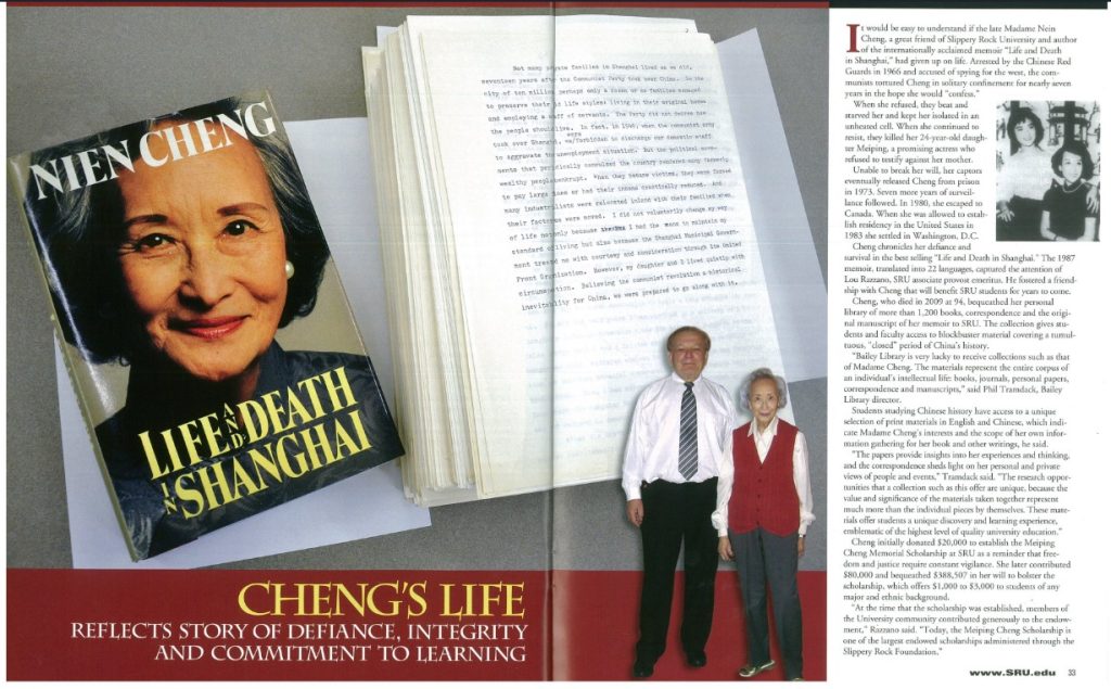 Life and Death in Shanghai, published in 1986, is Nien Cheng’s personal memoir about her experiences during China’s Cultural Revolution. Throughout her memoir, she describes hardships and successes, highlighting her perseverance and personal faith. Cheng went on numerous lecture tours to share her personal account of the trials and tribulations she revealed in her memoir. In both her book and her lectures, she reminisced on her family, personal accomplishments, personal loss, her imprisonment, and the freedom she found in the United States. Her memoir inspired many individuals and influenced Slippery Rock University administrator Louis Razzano to invite her to Slippery Rock University’s Honors Convocation.